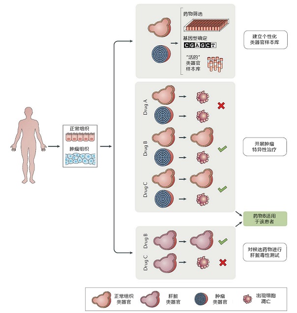 肿瘤类器官可以协助阐明病原体与癌症病发之间的联系。肿瘤类器官能协助探明不同癌症所演化出的不同突变类型,进而帮助找到针对不同突变的最佳疗法。肿瘤类器官还可以直接从遗传学的角度建立肿瘤的病发模型。如上图所示(Drost J, Clevers H. Organoids in cancer research. Nat Rev Cancer. 2018; 18 (7): 407-418),可以从患者的正常组织和肿瘤组织样本中建立类器官。类器官可以进行遗传学上的表征并用于药物筛选,能够将肿瘤的遗传背景与药物反应相联系。类器官也可以被冷冻保存并储存在类器官样本库中。从同一病人的正常组织中建立类器官能够通过药物筛选选择性地杀死肿瘤细胞而不伤害正常细胞,从而开发毒性较小的治疗药物。肝脏类器官可用于测试潜在药物的肝毒性。在上图的例子中,药物B最适合用于治疗该病人,因为它能针对性的杀死肿瘤细胞,且不会诱发肝脏毒性。