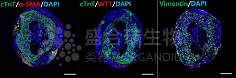 图3. hiPSC心脏类器官免疫荧光染色鉴定。分别对成熟心脏类器官进行免疫荧光染色。其中,cTnT用于标记心肌细胞,α-SMA用于标记血管平滑肌细胞,WT1用于标记心外膜细胞,Vimentin用于标记心脏成纤维细胞。比例尺:50 μm。