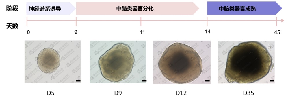图1. hiPSC中脑类器官构建流程图。比例尺:100 μm。