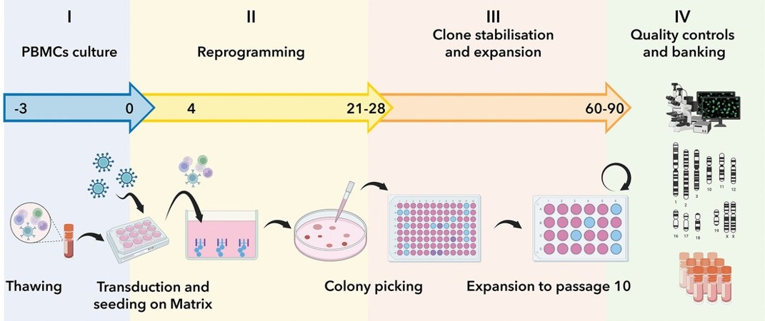 参考《人多能干细胞》团体标准(T/CSCB 0005-2021)、 《生物样本库多能干细胞管理技术规范》国家标准(GB/T 42466-2023)等,采集健康人或患者外周血样本,纯化获得外周血单个核细胞(PBMC)后利用非整合型重编程技术构建自体hiPSC。