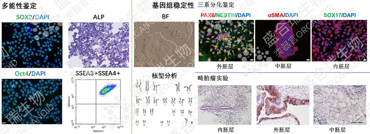 ↑ hiPSC多能性鉴定、基因组稳定性检测、三系分化鉴定及畸胎瘤实验。