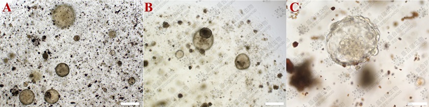 图1. 人肺泡类器官扩增、传代与分化状态示例。(A)在扩增培养至10天左右时,可观察到形成的囊泡状或实体结构。比例尺:500 μm。(B)传代培养过程中,可观察到相似的囊泡状或实体结构。比例尺:500 μm。(C)在分化培养至第10天左右,可观察到顶端上皮出现簇状小泡结构。比例尺:50 μm。