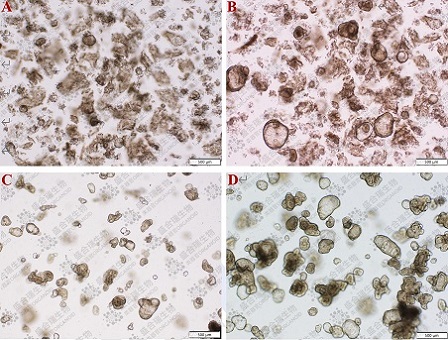 图1. 人小肠类器官原代培养、传代和复苏后的生长状态例图。(A-B)原代人小肠类器官的生长状态(P0),可见明显的生长趋势。原代类器官以囊泡结构为主,直径可达400 μm以上。(C-D)第一代人小肠类器官的生长状态(P1),传代后的类器官可见典型的出芽或厚壁形态,分化比例显著增多。比例尺:500 μm。