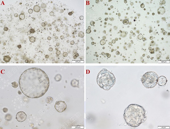 图1. 小鼠肺泡类器官扩增、传代及增殖与分化状态示例。(A)在扩增培养至7天时,可观察到大量囊泡状或实体结构。比例尺:500 μm。(B)传代培养过程中,可观察到相似的囊泡状或实体结构。比例尺:500 μm。(C)增殖阶段肺泡类器官以空泡囊状结构为主。比例尺:200 μm。(D)分化阶段肺泡类器官逐渐实心化,围绕囊体表面形成管状簇状肺泡样结构。比例尺:50 μm。