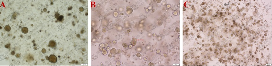 图1. 食管鳞癌类器官原代培养、传代和复苏后的生长状态例图。(A)原代食管鳞癌类器官的生长状态(P0)。类器官为实心球结构,直径约为80-100 μm。比例尺:100 μm。(B)第一代食管鳞癌类器官的生长状态(P1),传代后的类器官为规则的实心球结构。比例尺:100 μm。(C)复苏后的类器官表现出稳定的增长趋势。比例尺:200 μm。