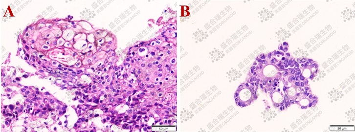 图2. 食管鳞癌组织和类器官HE染色。由图可见食管鳞癌组织(A)和食管鳞癌类器官(B)内细胞内核质比近似,且类器官中有中空的内腔,表现出一致的特异性聚集形态,说明类器官和来源组织在组织形态上相似。比例尺:50 μm。