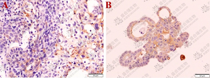 图3. 食管鳞癌类器官的panCK(癌特异性标志物)免疫组化染色。结果显示panCK在食管鳞癌组织(C)和食管鳞癌类器官(D)中细胞的细胞质中表达,说明食管鳞癌组织和对应类器官在癌特异性标志物表达上的一致性。比例尺:50 μm。