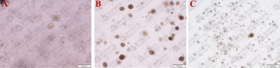 图1. 肺腺癌类器官原代培养、传代和复苏后的生长状态。(A)原代肺腺癌类器官的生长状态(P0)。类器官呈现边缘清晰的3D细胞球结构,直径约为100 μm。比例尺:200 μm。(B)第一代肺腺癌类器官的生长状态(P1),传代后的类器官以球体结构为主,数量明显增多,直径可达300 μm。(C)复苏后的肺腺癌类器官表现出稳定的增长趋势。比例尺:500 μm。