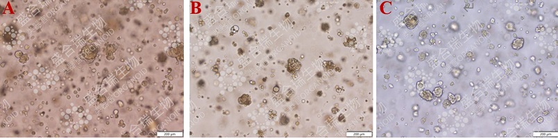 图1. 肺鳞癌类器官原代培养、传代和复苏后的生长状态。(A)原代肺鳞癌类器官的生长状态(P0)。类器官主要为不规则球体结构,直径可达100 μm。(B)第一代肺鳞癌类器官的生长状态(P1),传代后的类器官生长较好,且多为不规则球体结构。(C)复苏后的肺鳞癌类器官表现出稳定的增长趋势。比例尺:200 μm。