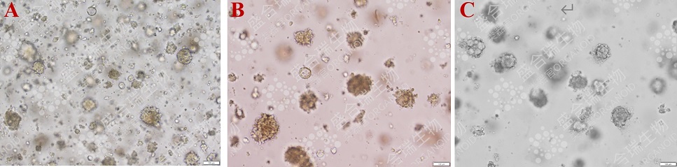 图1. 小细胞肺癌类器官原代培养、传代和复苏后的生长状态。(A)原代小细胞肺癌类器官的生长状态(P0)。类器官呈现空泡和实质型3D细胞球,直径约为80-100μm。(B)第一代小细胞肺癌类器官的生长状态(P1),传代后的类器官主要为实质结构。(C)复苏后的小细胞肺癌类器官表现出稳定的增长趋势。比例尺:100 μm。